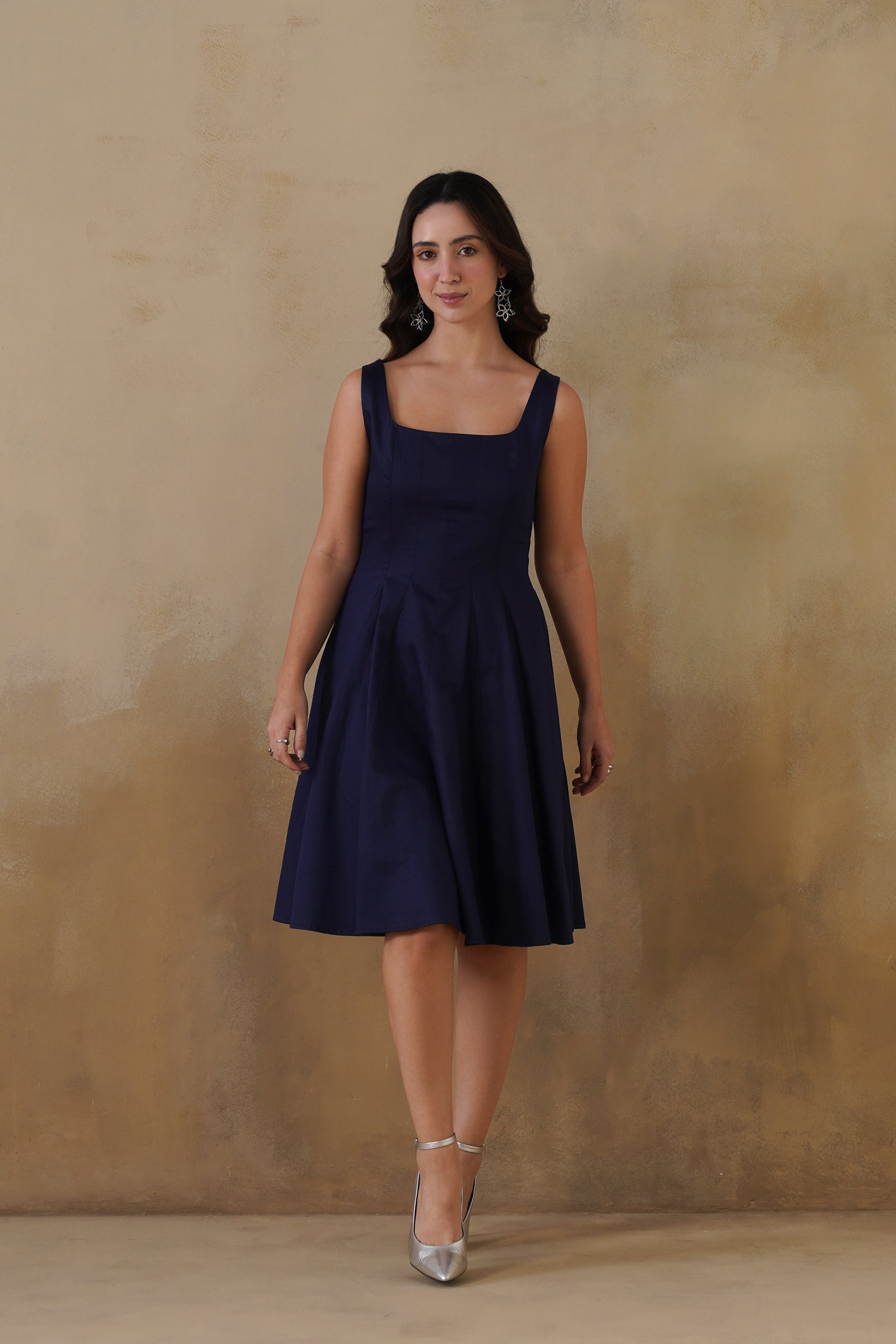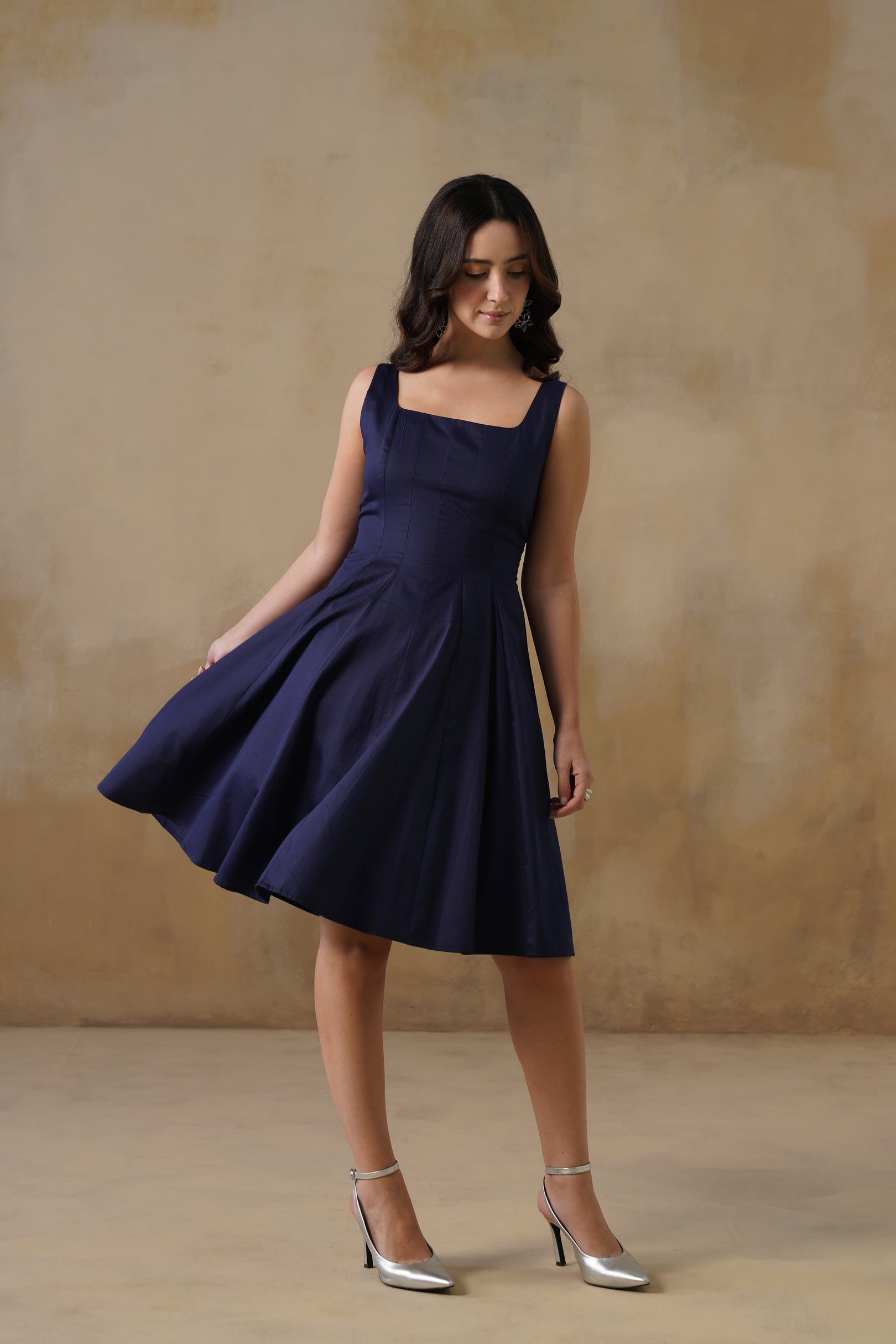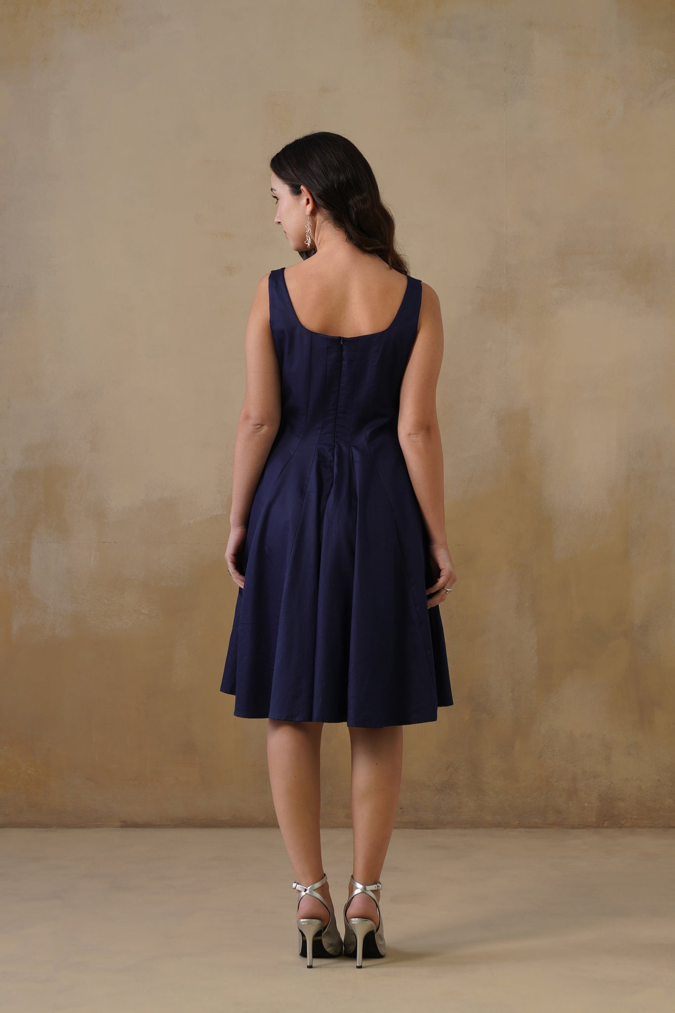 This navy blue panelled short dress exudes a sense of romance and nostalgia. The way the flare of the skirt swirls like a frock from a bygone era brings an element of playfulness and charm. It’s the kind of dress that’s perfect for everything from an afternoon garden party to an evening out, with its classic appeal and just enough modern detailing to make it feel fresh.