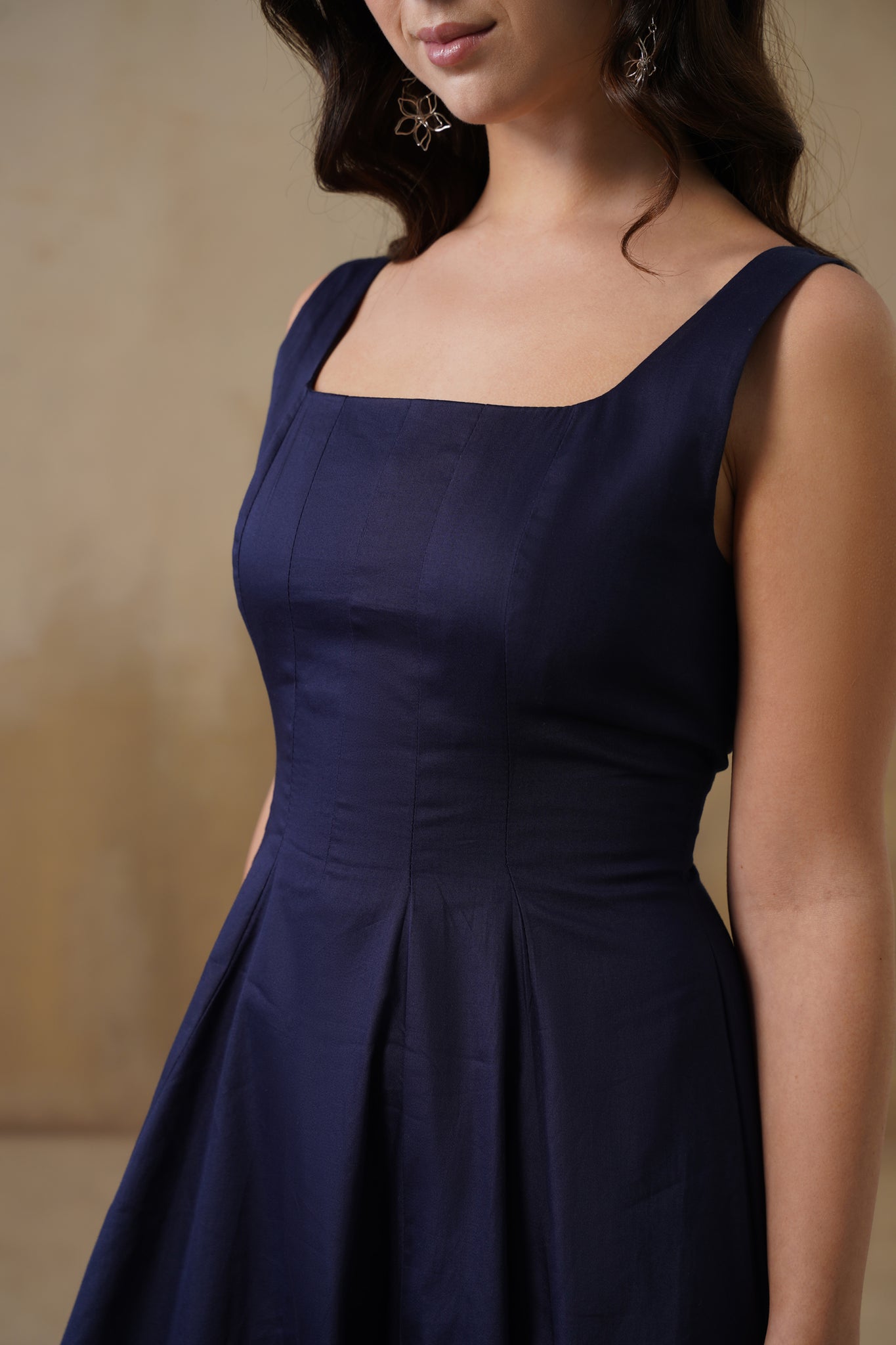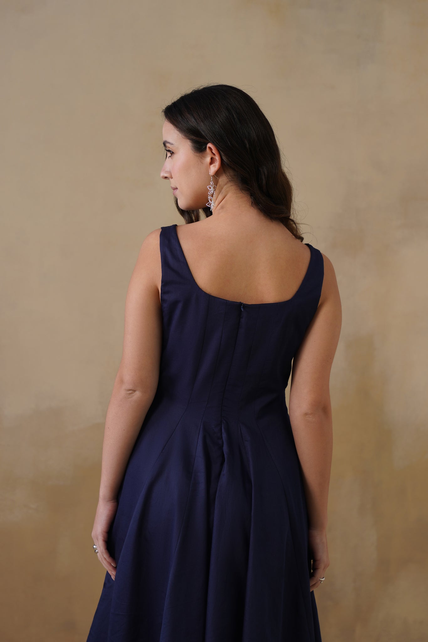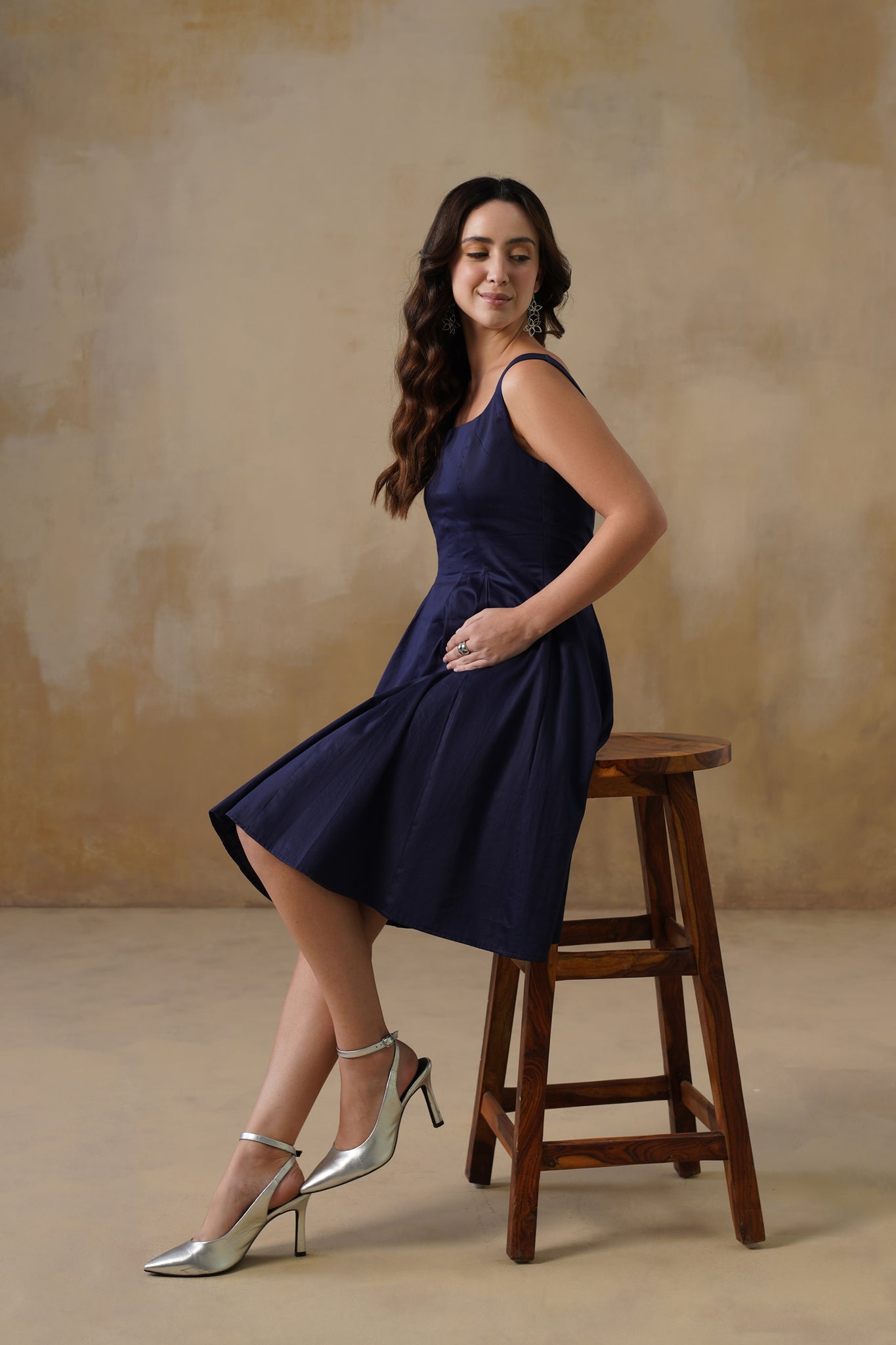 This navy blue panelled short dress exudes a sense of romance and nostalgia. The way the flare of the skirt swirls like a frock from a bygone era brings an element of playfulness and charm. It’s the kind of dress that’s perfect for everything from an afternoon garden party to an evening out, with its classic appeal and just enough modern detailing to make it feel fresh.