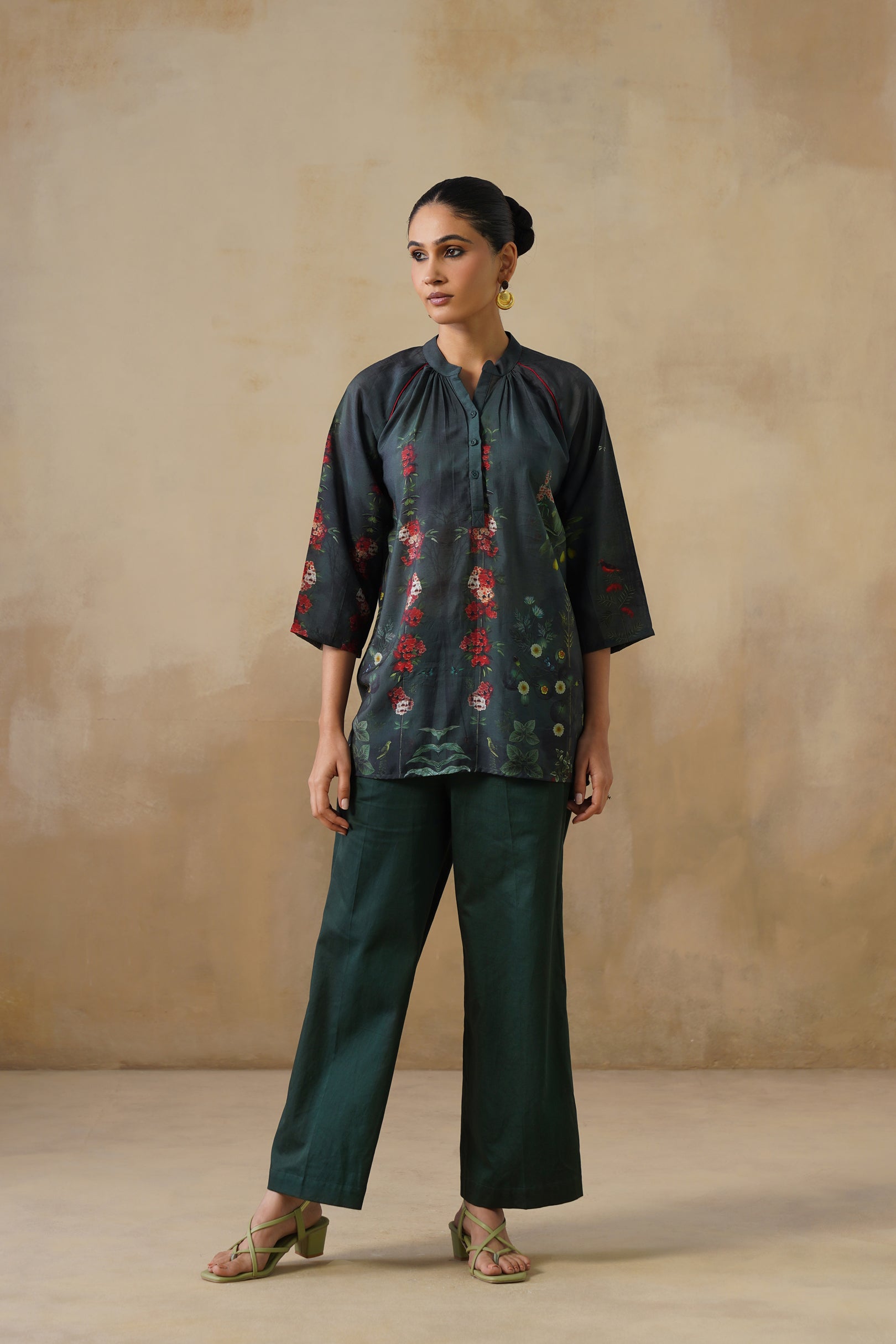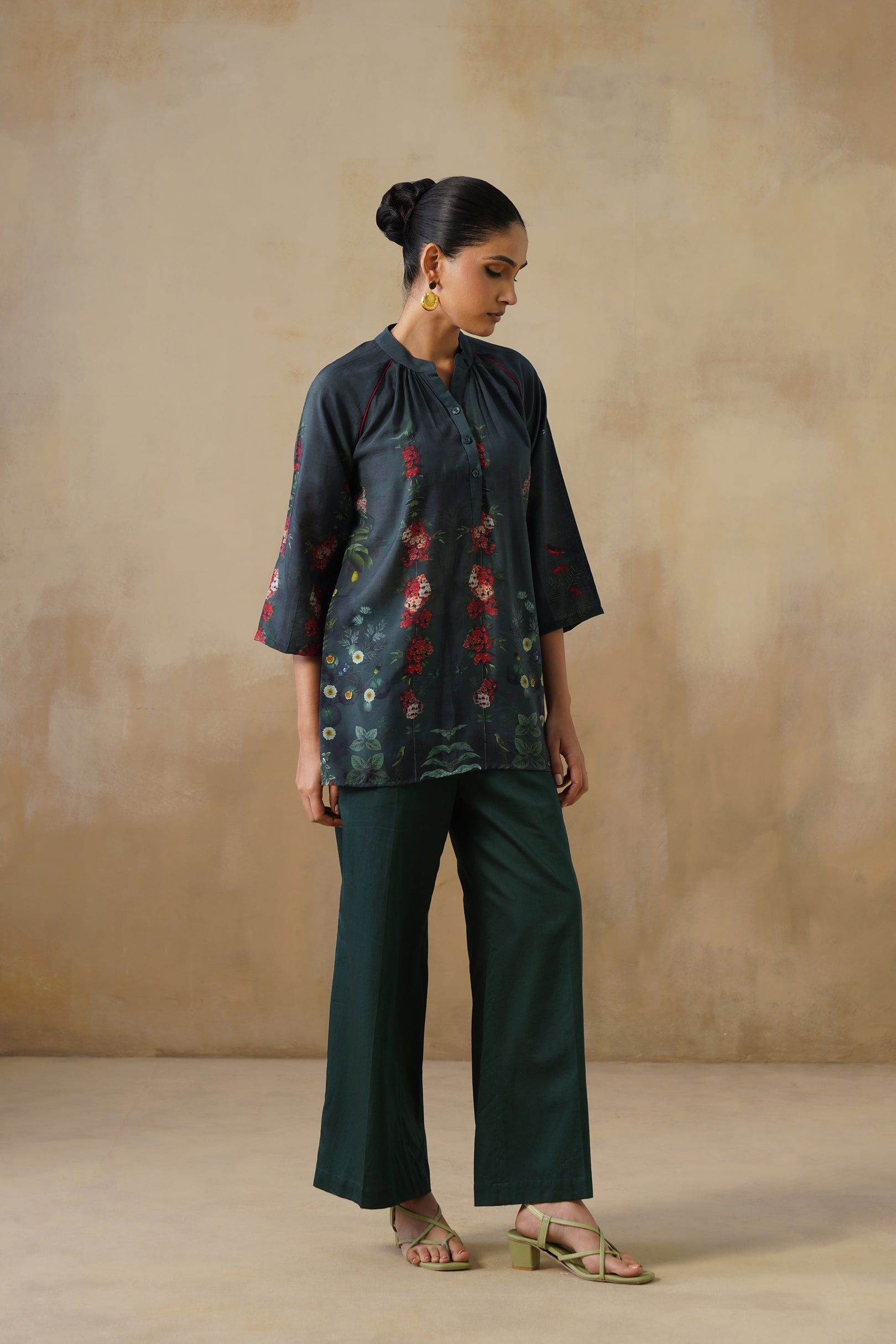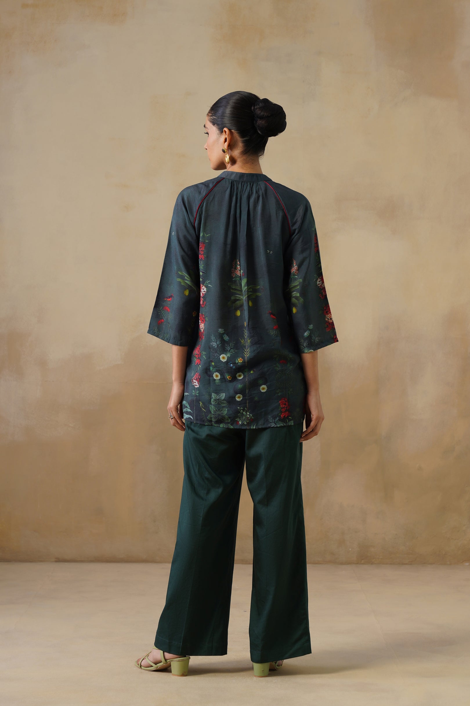 The neckline is a neat band collar with a button placket, keeping the design sophisticated yet minimal. Three-quarter sleeves, slightly flared for ease, are enhanced with matching floral accents, tying the look together seamlessly. The length makes it versatile — easy to pair with trousers, palazzos, or even denims for a contemporary twist.