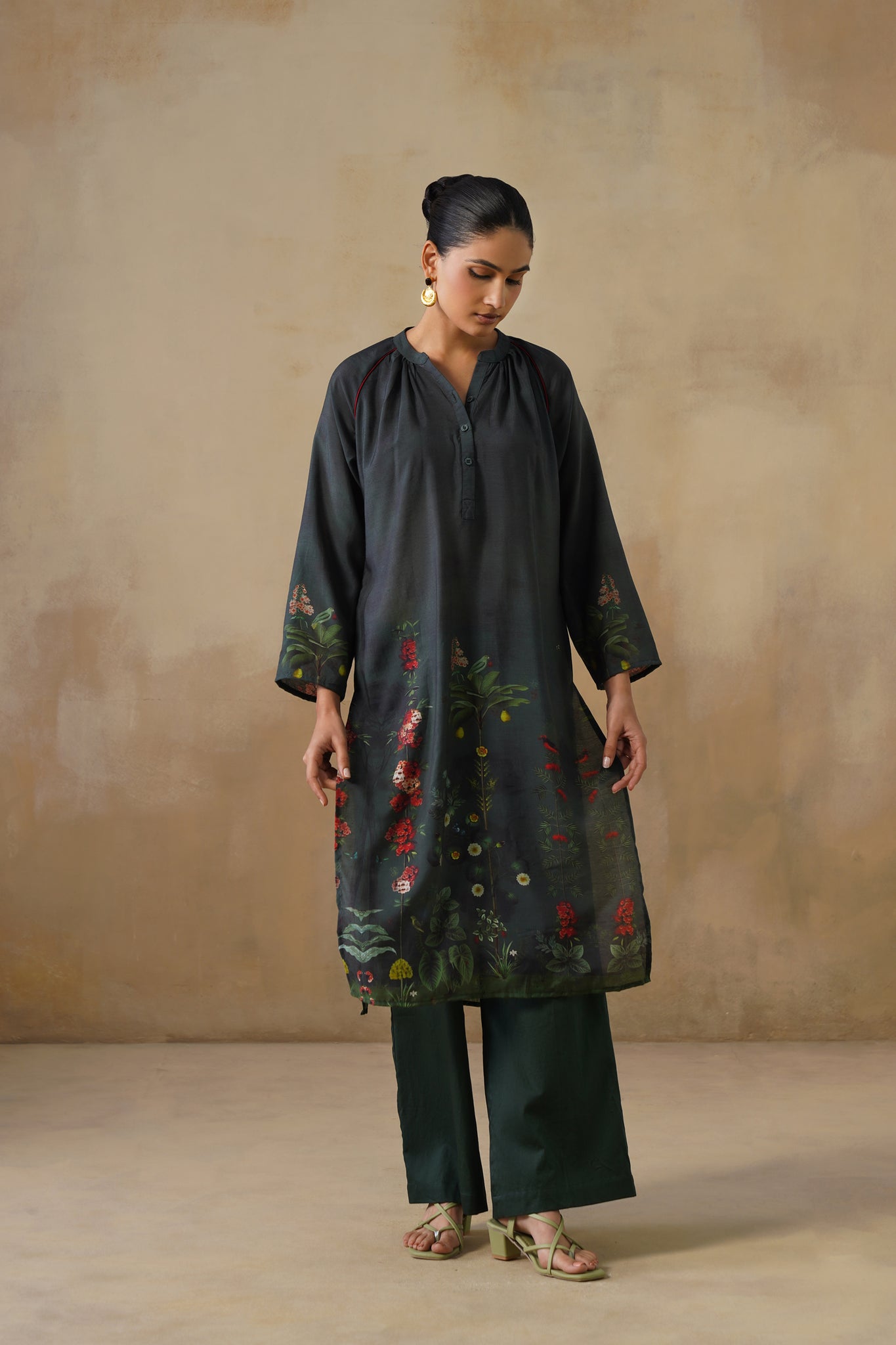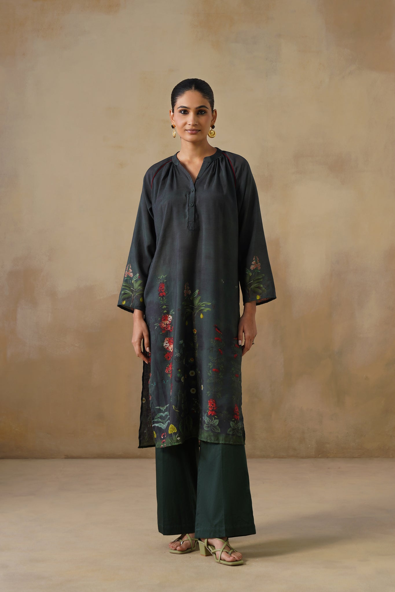 Cut in a relaxed straight silhouette, it features a soft charcoal-green base with a subtle sheen that feels both earthy and refined. The neckline is a modest split placket with a short buttoned front, gently gathered for a touch of drape in soft Chanderi cotton Silk, while the raglan sleeves lend effortless comfort.