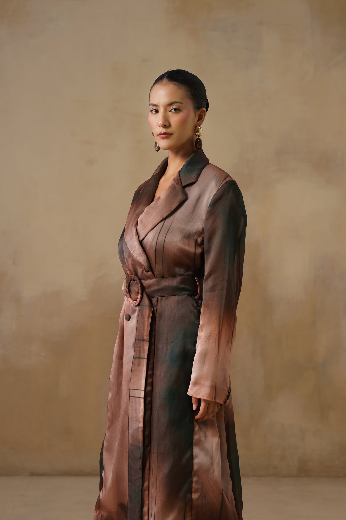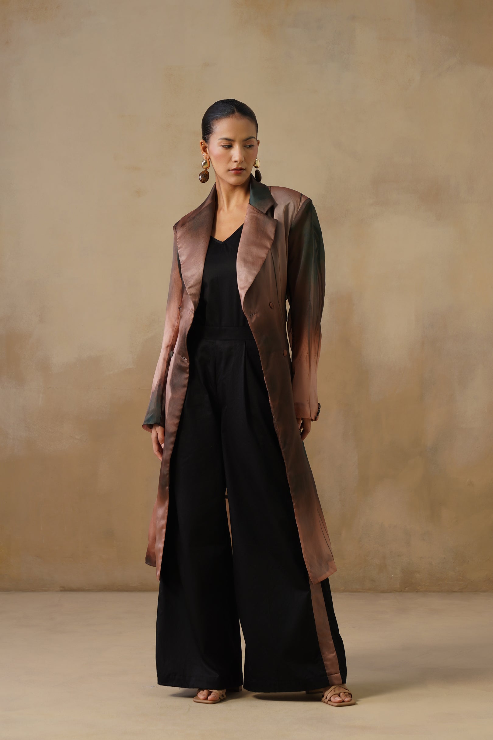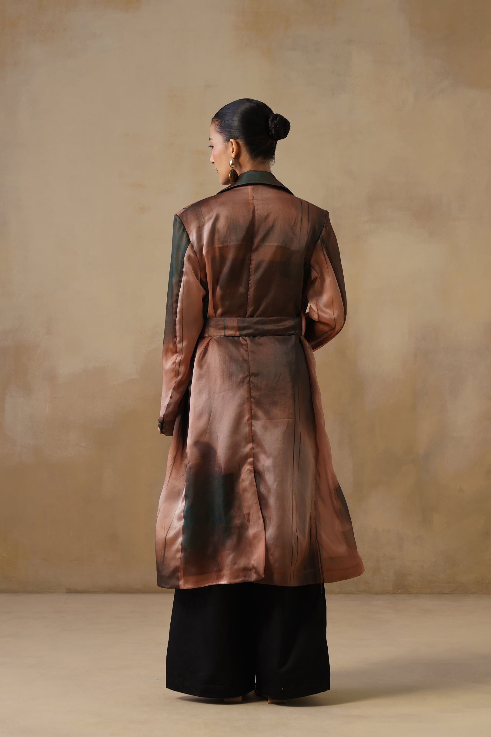 This sheer organza trench coat in satin organza is a statement in understated luxury. Designed with a fluid, lightweight drape, it offers the structure of a classic trench while embracing the delicacy of sheer layering. The soft gradient of earthy bronze and deep undertones lends the piece a sophisticated, modern edge, making it versatile enough to elevate both day and evening looks. Featuring wide lapels, a double-breasted front, and a longline silhouette, this cover-up is perfect for slipping over sleek separates or occasionwear, adding an air of effortless refinement. Ideal for those who love outerwear that bridges power dressing with poetic elegance.