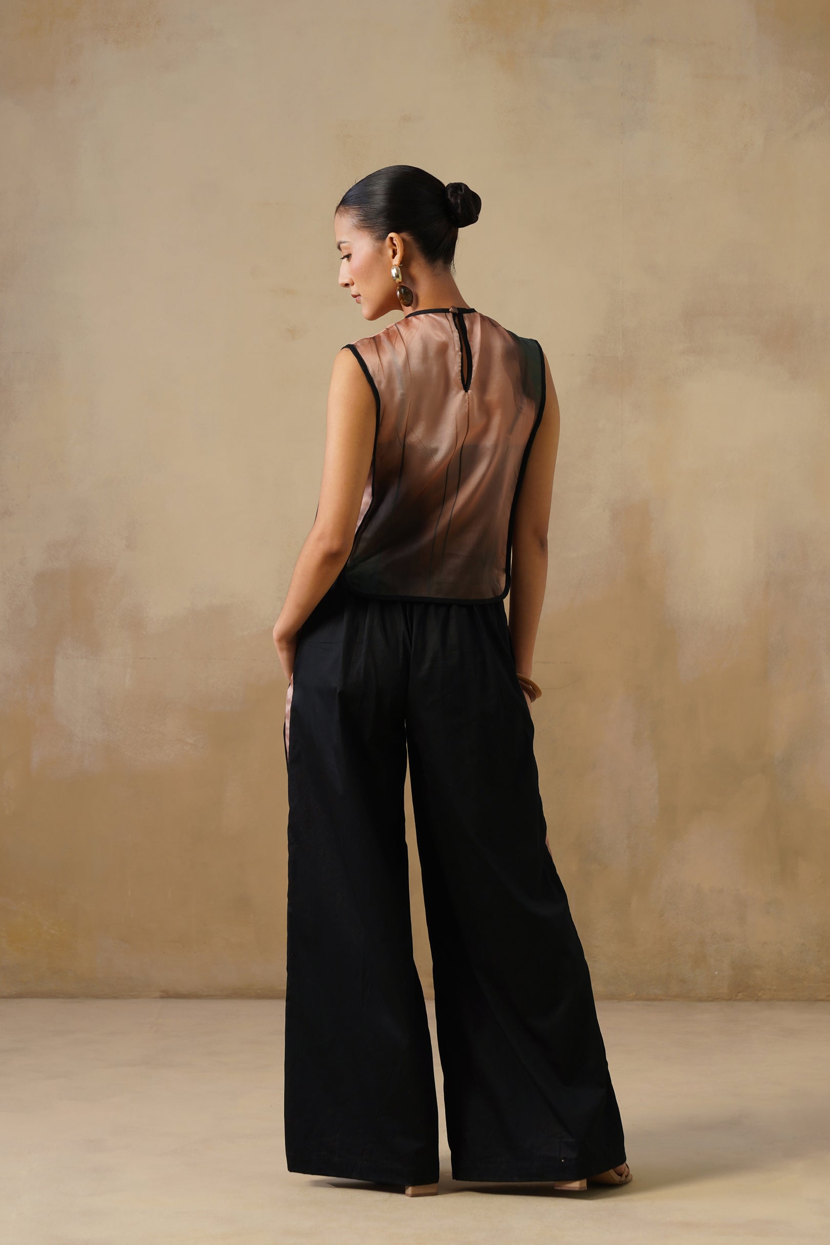 These pants are a modern take on relaxed tailoring, designed with a wide-leg silhouette that flows with effortless ease. Crafted in a deep black fabric, they are elevated with subtle sheen side panels in a soft bronze hue that run along the length of the legs, adding both structure and a touch of glamour. The high-waist cut elongates the frame, while soft pleats at the front create movement and comfort. Versatile yet statement-making, these pants strike the perfect balance between understated elegance and contemporary edge — ideal for styling with sheer overlays, structured tops, or minimalist blouses.