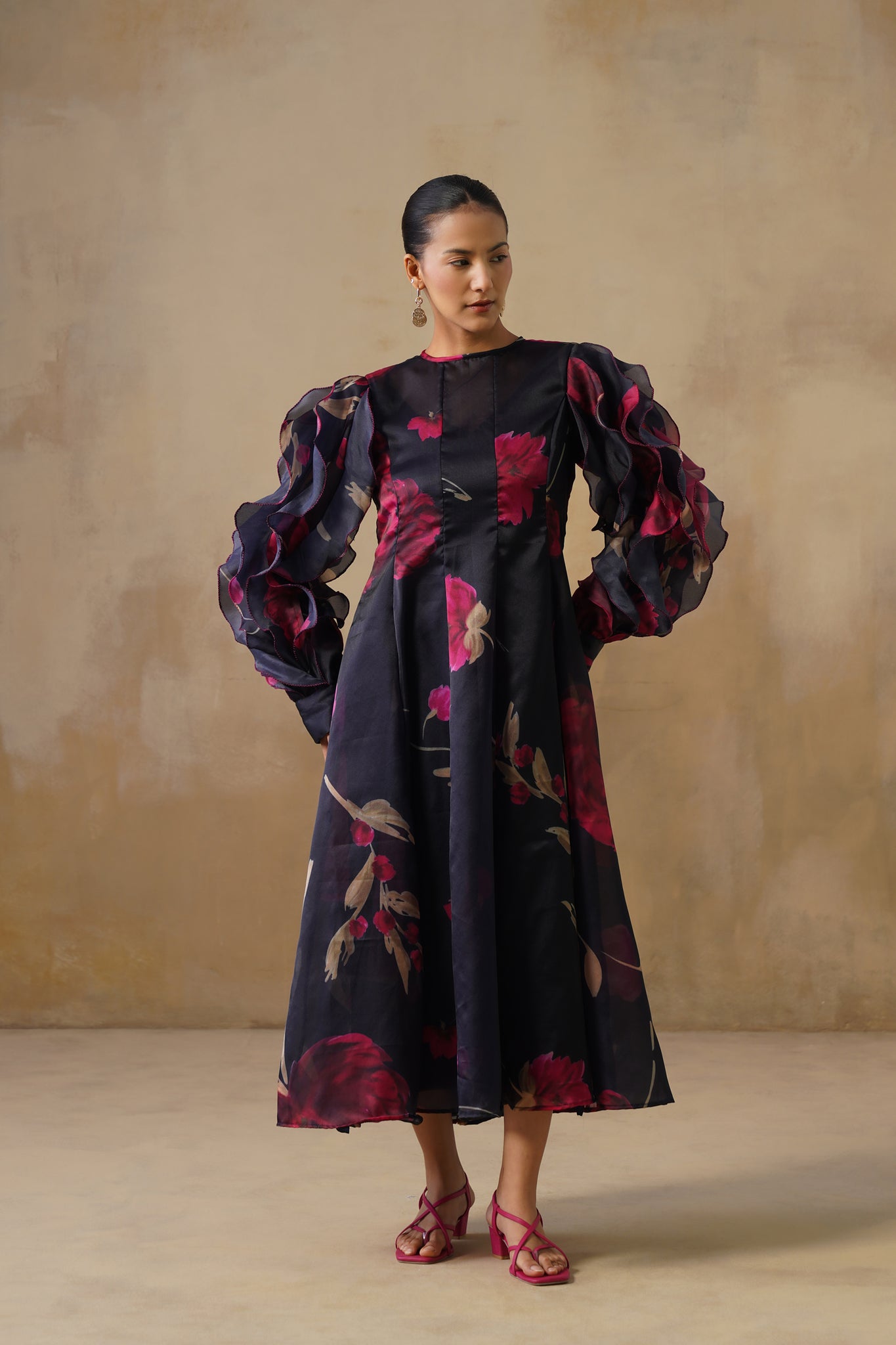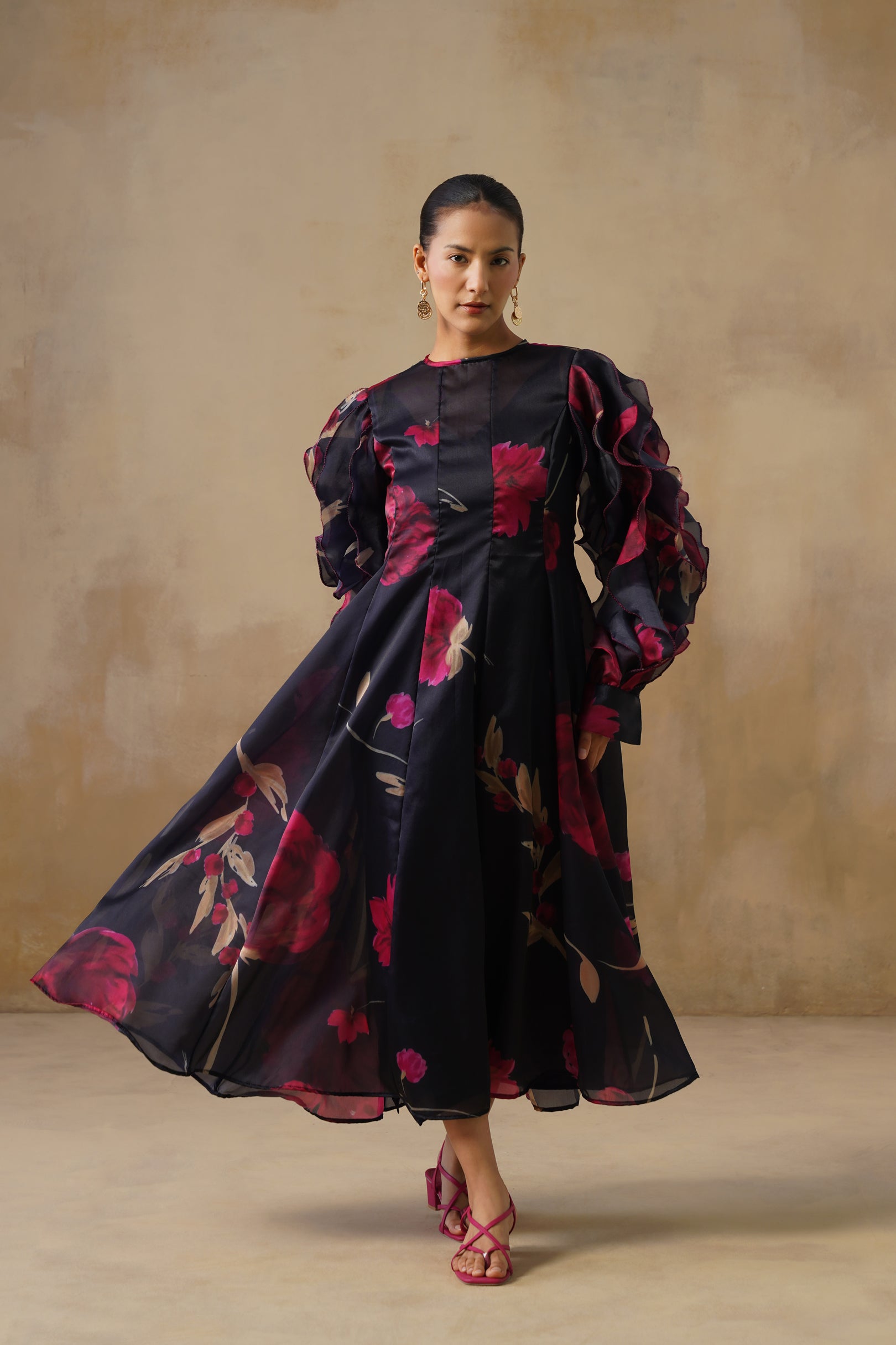 This flowing midi dress is a statement in elegance and drama, designed to turn heads with its striking details. Crafted from sheer black fabric adorned with bold crimson florals, it creates a captivating contrast that feels both timeless and modern. The silhouette features voluminous, ruffled puff sleeves that add sculptural dimension, while the fitted bodice flows into a graceful flared skirt, allowing for beautiful movement with every step. Perfect for evening soirées, weddings, or special occasions, this dress blends romantic artistry with contemporary sophistication, making it a true wardrobe centerpiece.