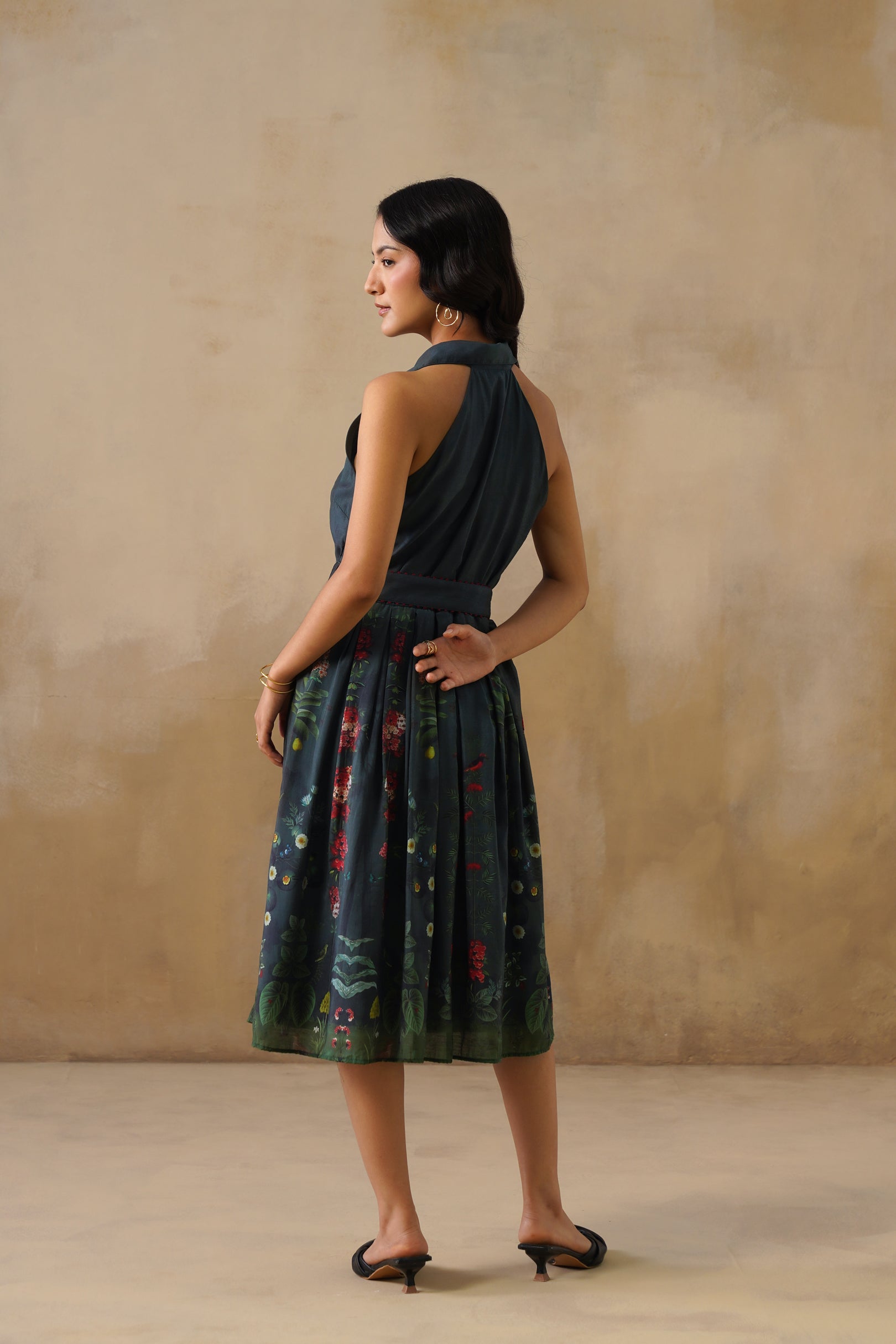 The skirt falls in soft pleats to a midi length, offering graceful movement and ease. Along the hem, vibrant botanical prints in red, green, and yellow bloom against the dark canvas, creating a striking garden-inspired contrast. The balance of clean lines at the top and fluid florals at the bottom makes this piece versatile — perfect for daytime elegance, resort wear, or a sophisticated evening out.