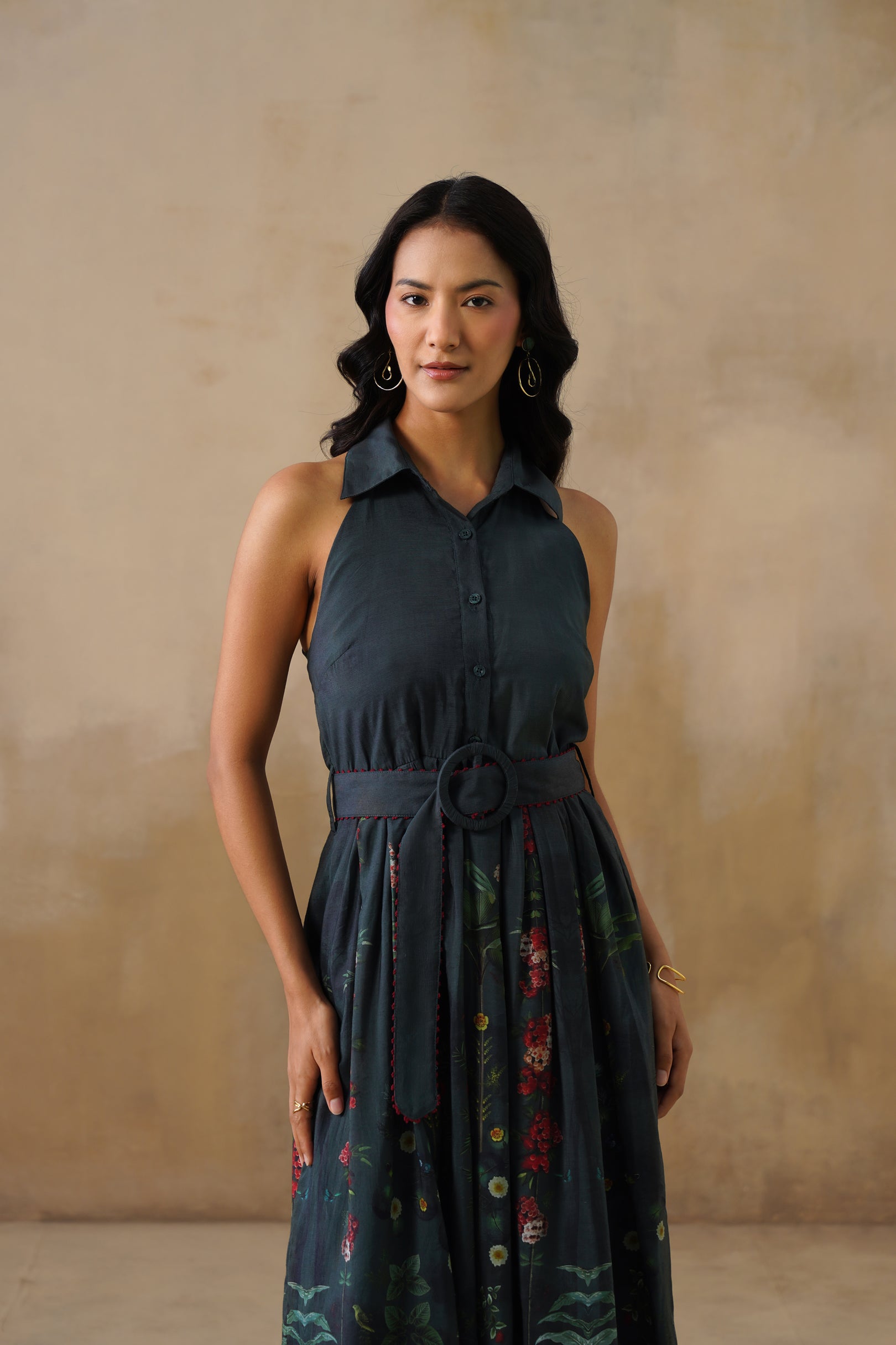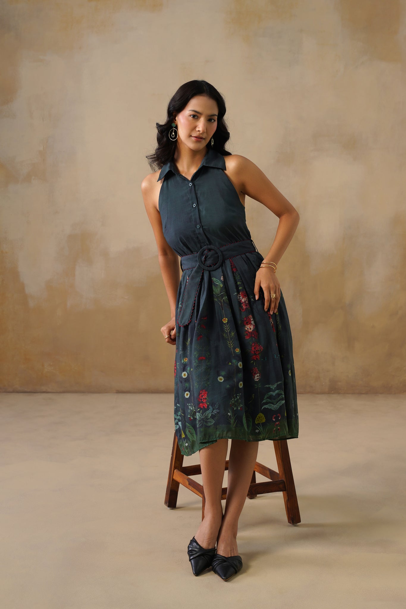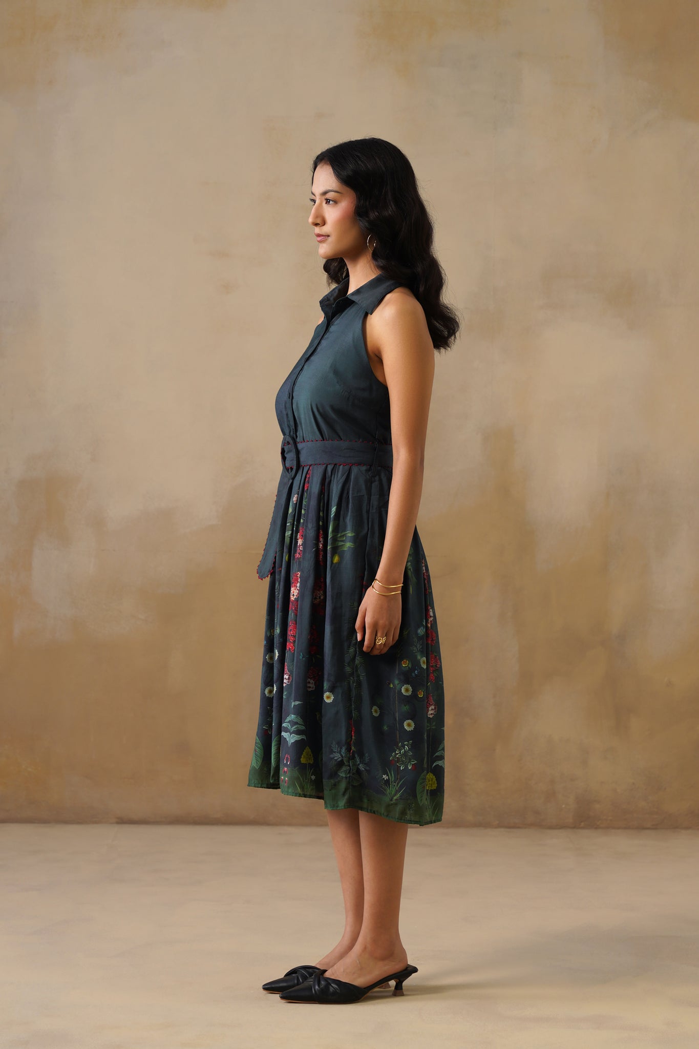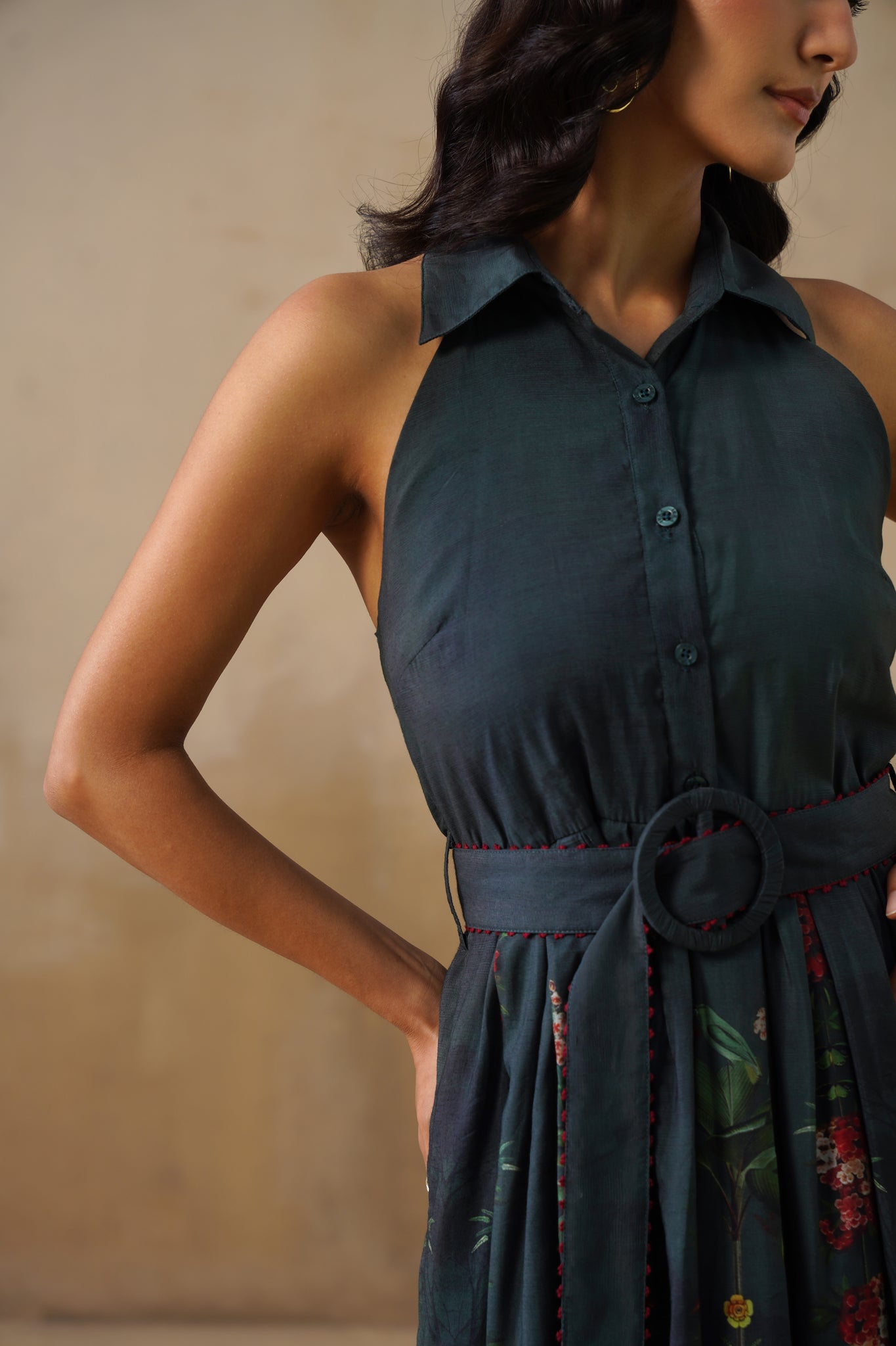 This dress is a chic blend of tailored structure and playful femininity. Crafted in a deep green base, it features a sleeveless, collared bodice with a button-down front, giving it a polished shirt-dress appeal. The waist is cinched with a matching fabric belt featuring a statement round buckle, accentuating the silhouette while adding a touch of modern edge.