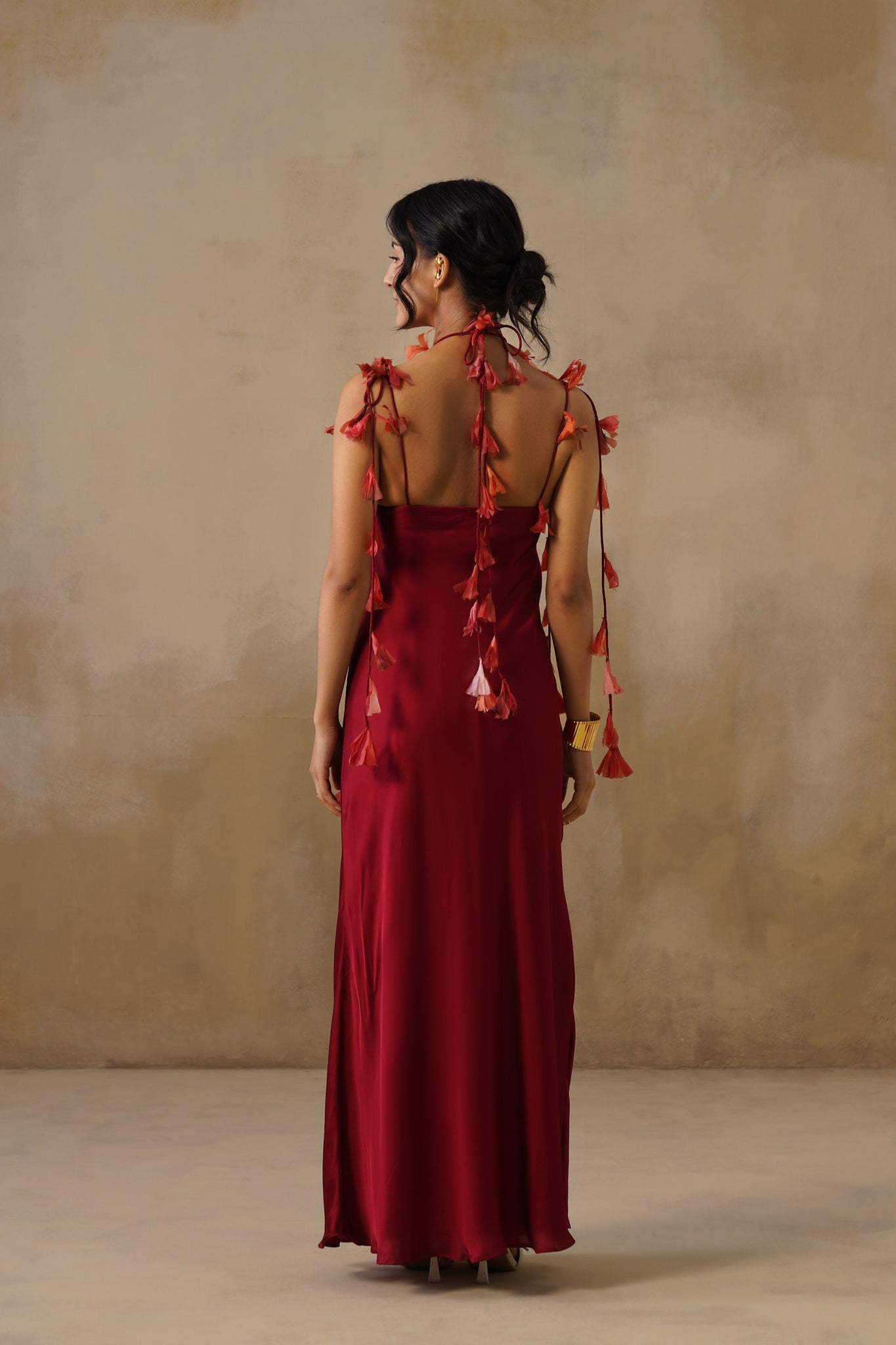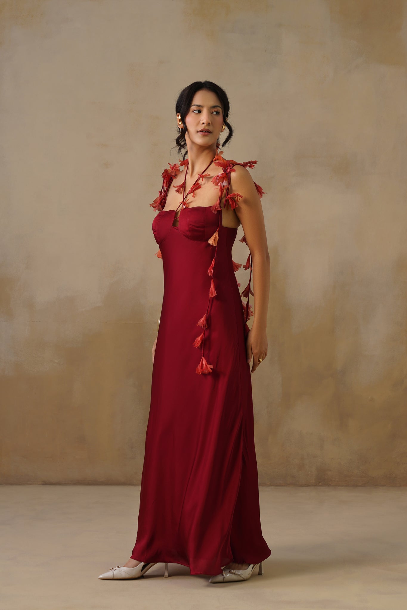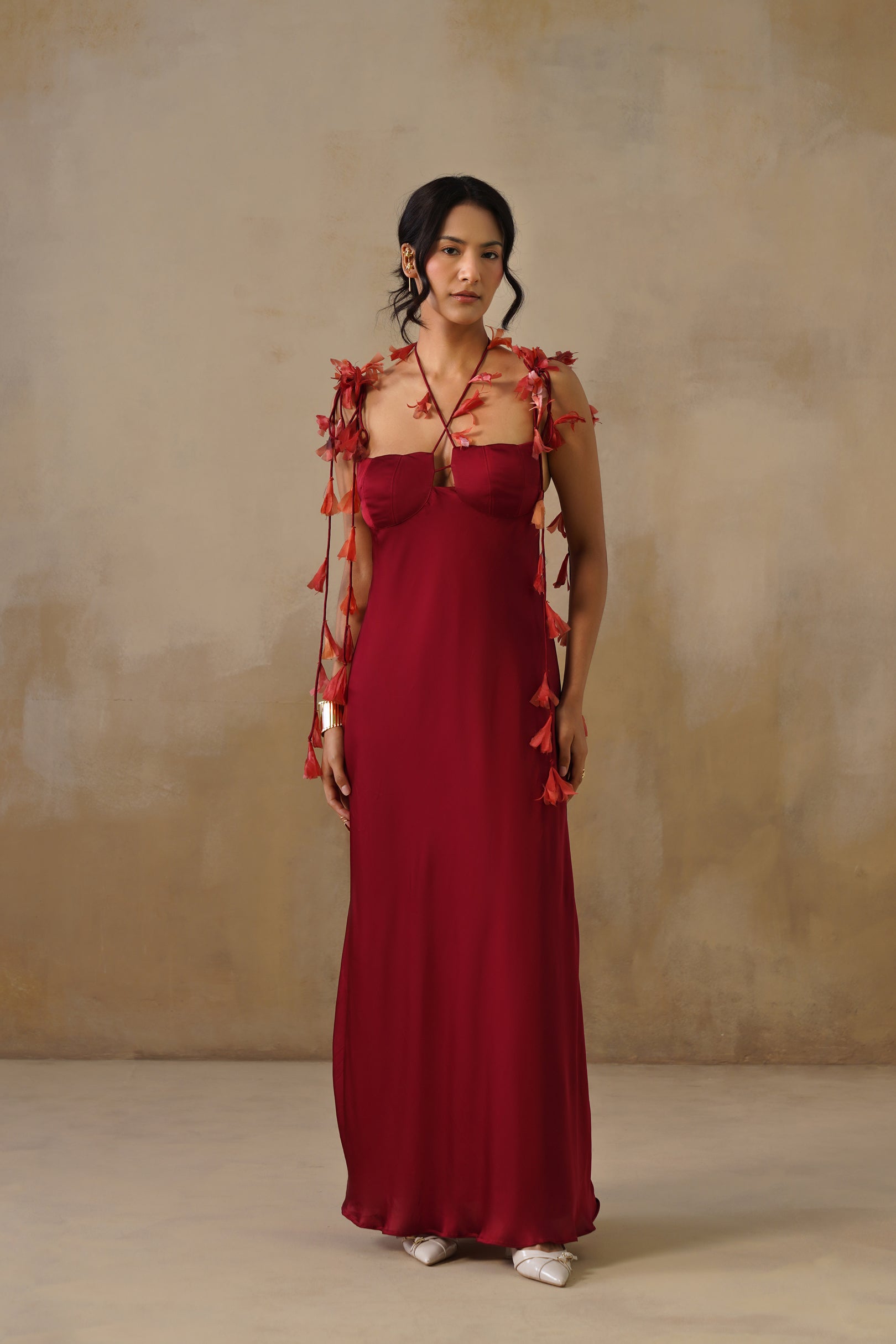 The centerpiece of the collection, this gown is a celebration of duality and timeless elegance. Designed to be worn two ways, it transforms effortlessly from a bold, painterly floral statement to a sleek, sensual solid in deep crimson. The dress features delicate 3D floral appliqué straps that cascade like vines, lending sculptural romance to both sides.